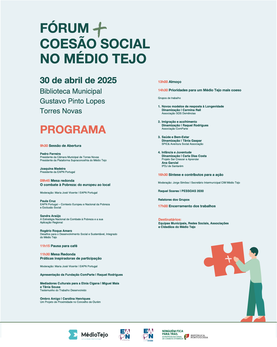 Dirigido a equipas municipais, entidades sociais, associações e comunidade em geral, o Fórum + Coesão Social pretende ser um espaço de diálogo participativo e de construção de soluções sustentáveis e integradas, com o propósito de reforçar a inclusão social e promover uma verdadeira coesão territorial.