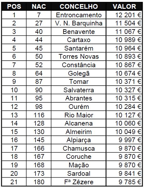 O Entroncamento é o concelho do distrito de Santarém com valor de rendimentos mais elevado, com um valor mediano do rendimento bruto declarado deduzido do IRS liquidado de 12.201 euros. Barquinha, Benavente, Cartaxo e Santarém ocupam o Top 5 na região, enquanto Mação, Sardoal e Ferreira do Zêzere estão no fundo da tabela de 21 municípios da Lezíria e Médio Tejo.