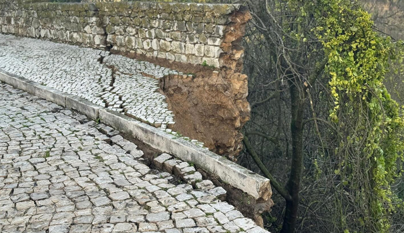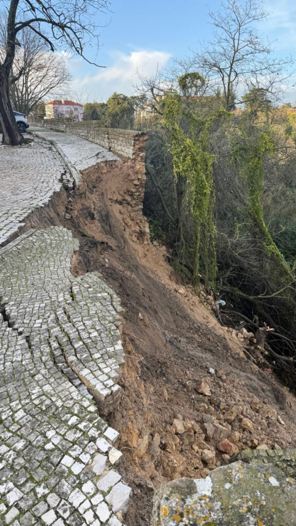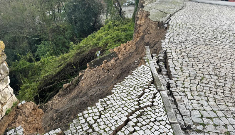 Parte do miradouro da rua Luís de Camões, junto à antiga clínica médica, no centro histórico de Santarém, que esta manhã foi evacuado por perigo eminente de derrocada, já abateu, com derrocada do muro e deslizamento de parte da barreira que dá para a EN 114, na zona da estrada das curvas.